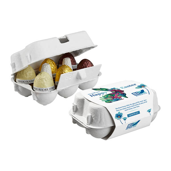 Branded Paper Egg Box with mix of Ferrero Rocher Eggs with persinalised promotional sleeve. Milk Chocolate, white chocolate and dark chocolate eggs filled with hazelnut cocoa cream.
