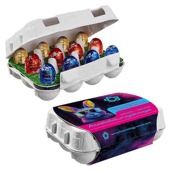 Paper Egg Box with mix of Ferrero Rocher Eggs with promotional sleeve and additional 4 c printed insert in grass design. Milk Chocolate, white chocolate and dark chocolate eggs filled with haxelnut cocoa cream.
