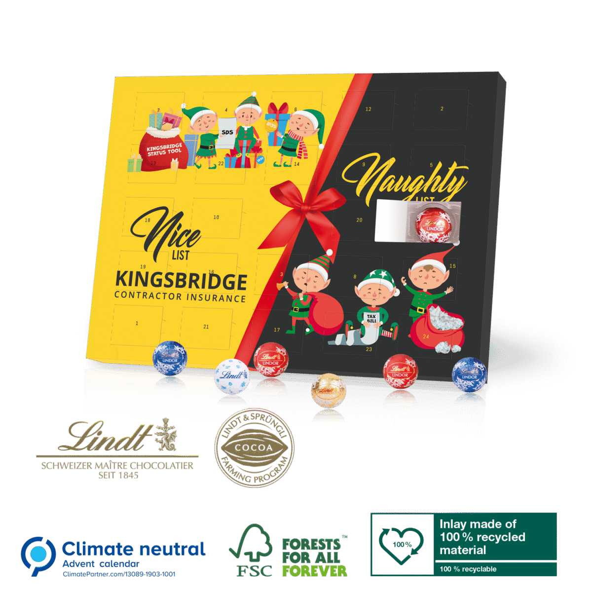 Bespoke Gourmet Lindt Desktop Advent Calendar Promotional desktop Gourmet Lindt Chocolate Advent Calendar with stand ( 225x165x25mm) filled with 24 Lindor foil wrapped luxury chocolates (110g of chocolate) Calendars are fully printed all over with your own artwork or choose from one of our standard designs and simply add your logo. Calendars come stamped with the following sustainable stamps: Climate neutral, FSC certified, 100% recycled and recyclable, and Lindt cocoa farming project.