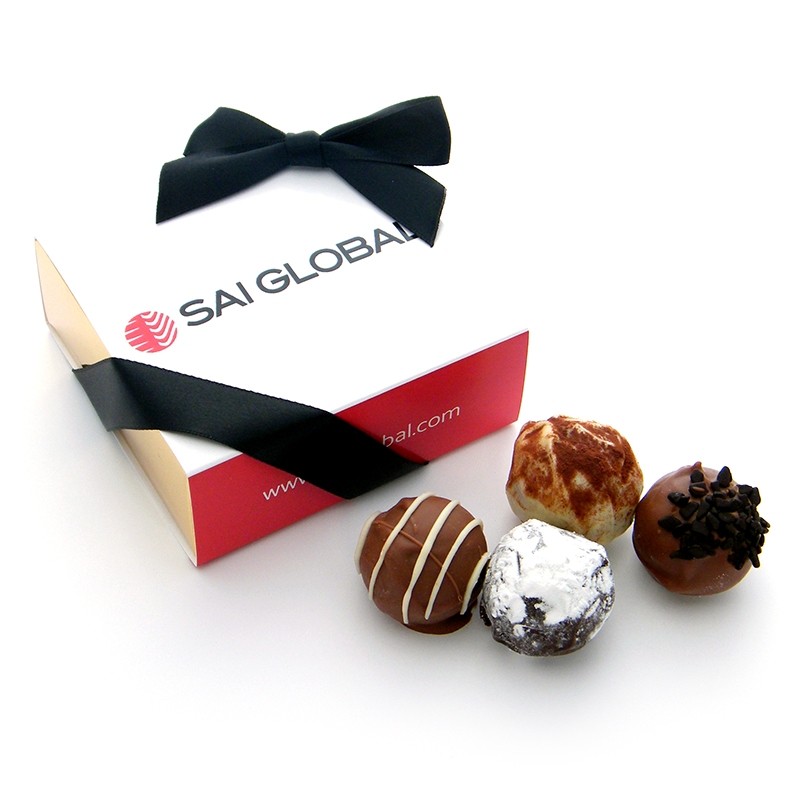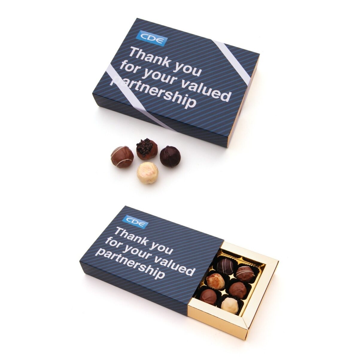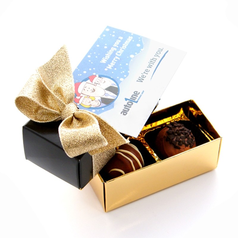 Custom-made box with a Christmas Logo/image and text to suit you and your company. Choose from a range of chocolates and truffles per box. Promotional chocolate gifts branded with your company logo are an excellent way to promote your company, as a thank-you gift or as an employee incentive.