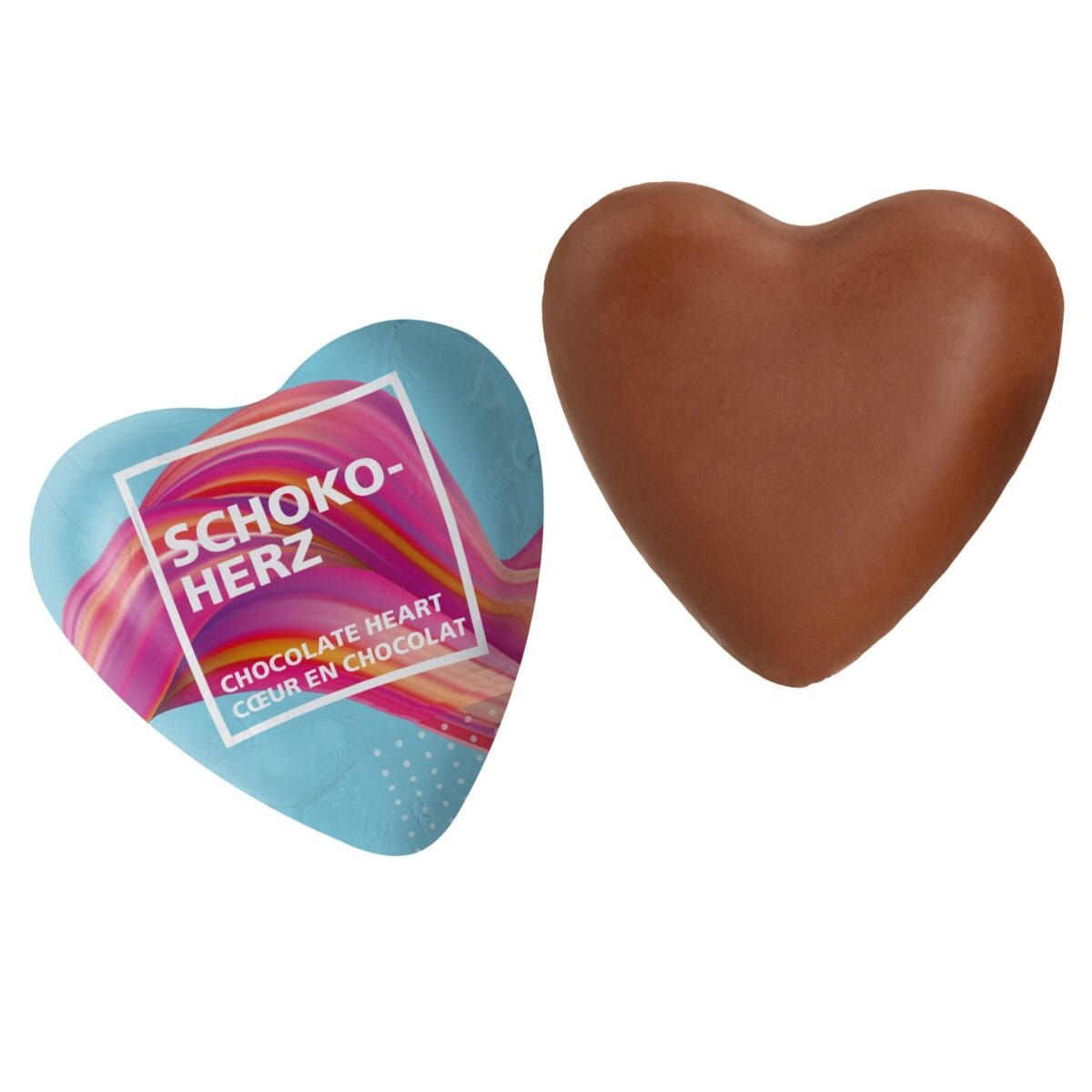 Full Colour Printed Chocolate heart, individually wrapped in aluminium foil, silver on the inside. 40mm by 40mm
