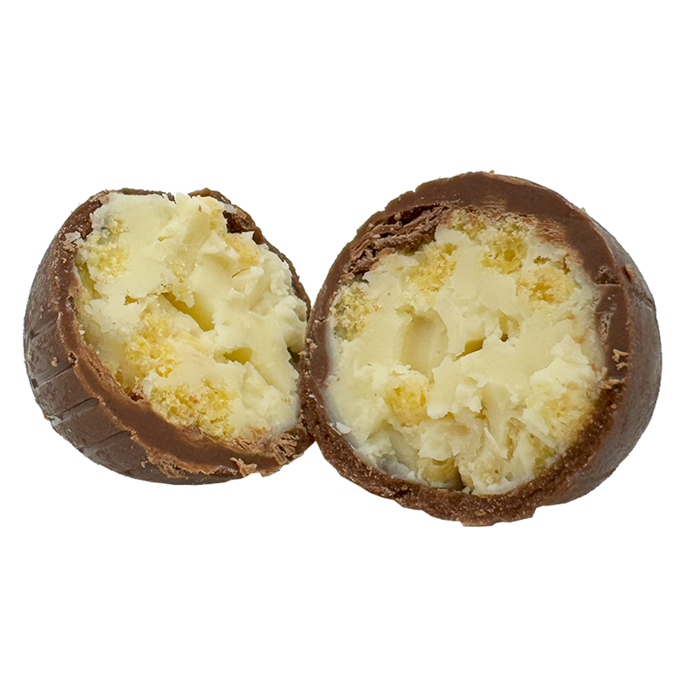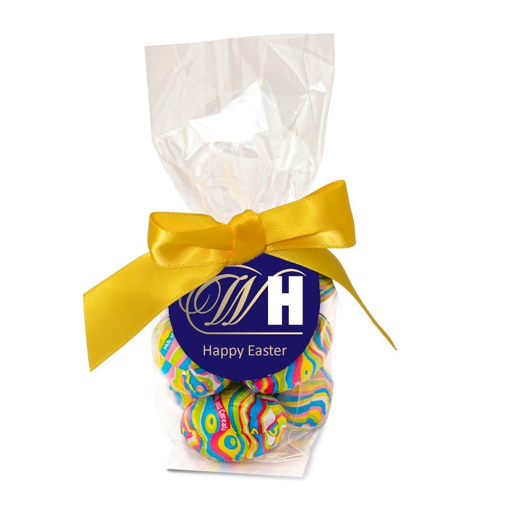 Milk chocolate crème crunch eggs with a bespoke full colour personalised card or sticker. Various bag sizes available to suit budget.