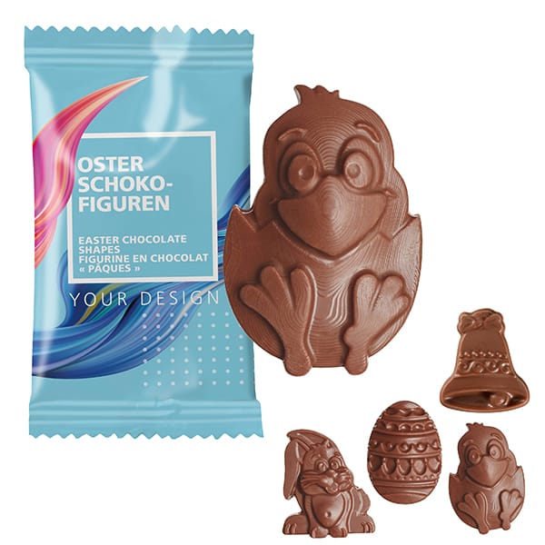 Chocolate Shapes made out of milk chocolate with Easter bunny, egg, chick. mixed (bunny, egg, chick) or single variety (bunny, egg, chick, Easter bell) individually packed in a paper flowpack.