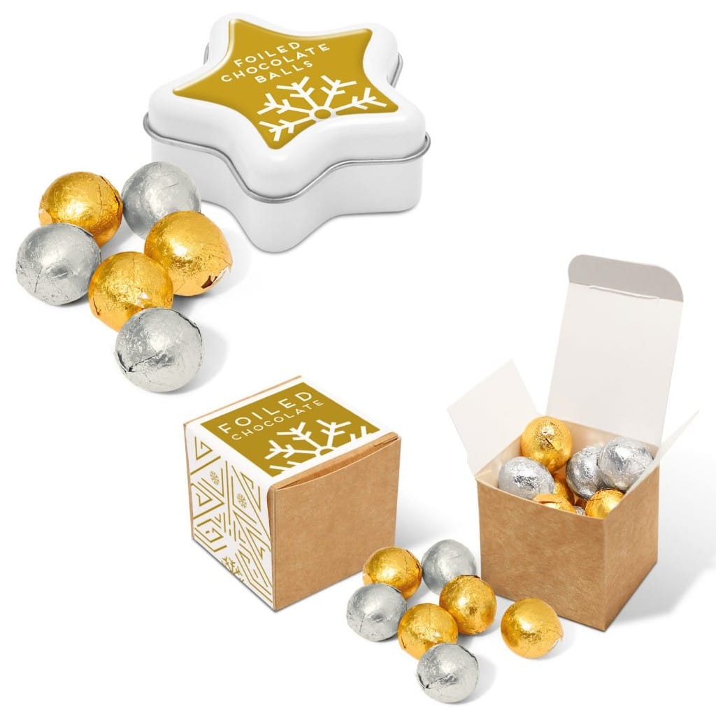 • Eco Kraft Cube filled with gold and silver foiled balls. Branded with a full colour paper wrap to the outside of the cube.
