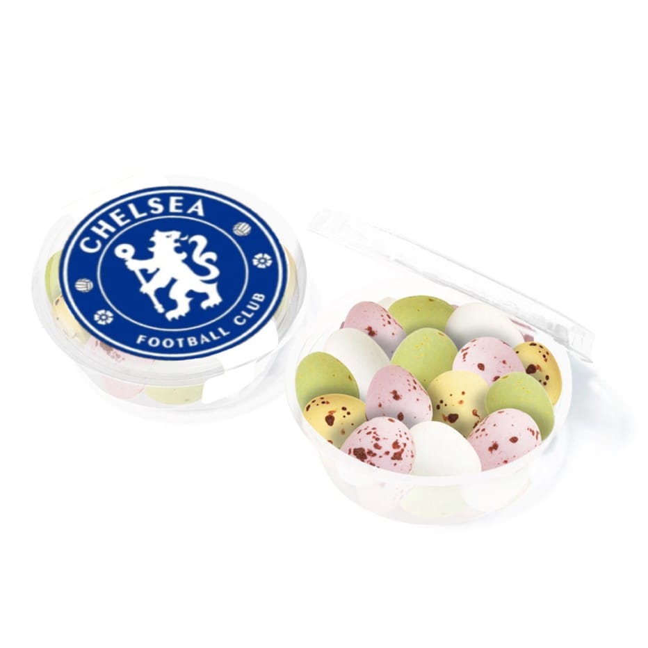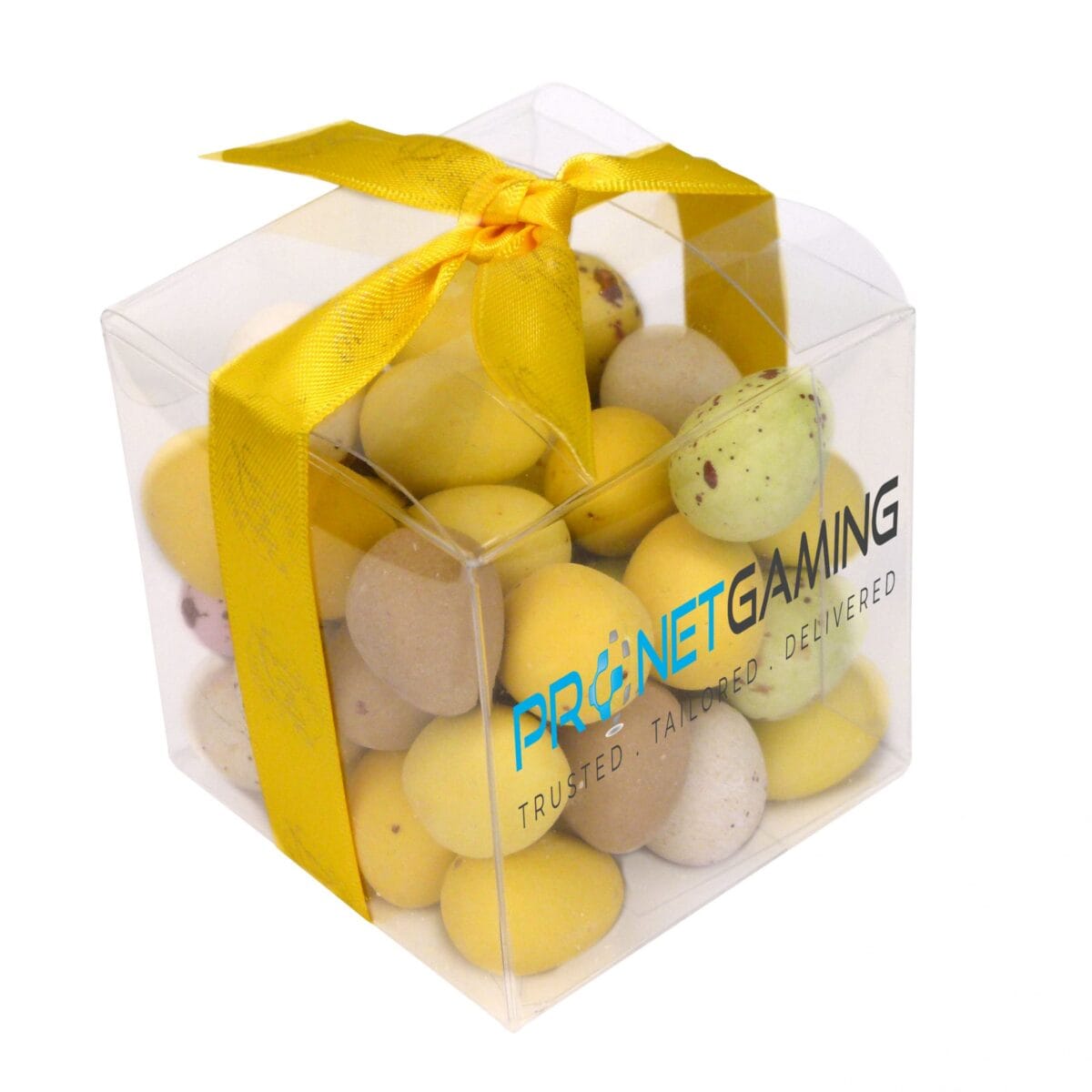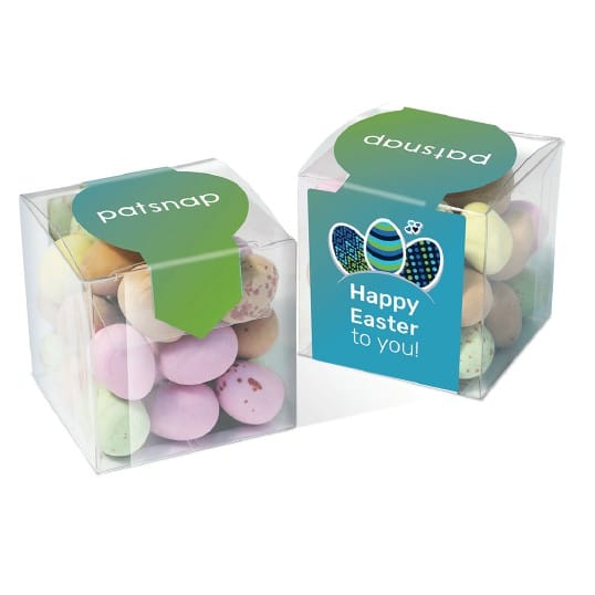Scrumptious freshly made chocolate made here in the UK. Promotional box of speckled Milk chocolate Easter eggs with logo printed on the front. Hand finished with a personalised ribbon or swing tag with your logo/message of choice. Each cube measures approx. 60mm x 60mm and contains 100g of eggs. If you need a quote for a larger amount than shown please do ask for a quote Click the link below to see our Easter Eggs and chocolate range; https://thechocolatepeople.co.uk/product-category/promotional-easter-gifts Please ask us for a quote of the volume you thinking about by either using the form below or just give us a bell at 01903 750999