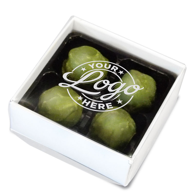 Promotional – 4 Chocolate Christmas Truffles Presented in a White Box Finished With A Clear PVC With Your Logo or Message Print on Lid