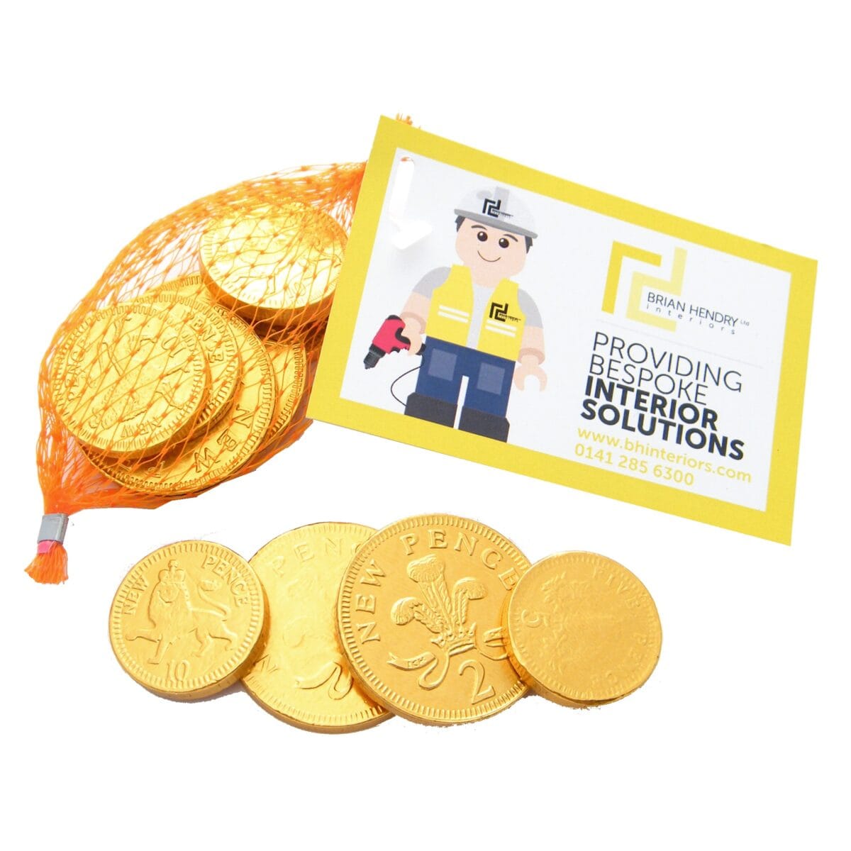 Personalised Chocolate Coin Nets Promotional chocolate gold coins in nets personalised for your business are always a welcome promotional gift. Promotional chocolate money is perfect to promote any business involved in finance or promoting a special offer at any time of year.