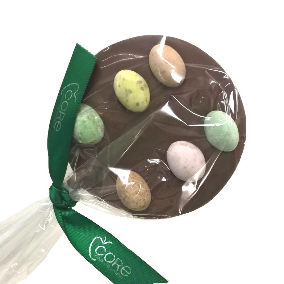 Promotional chocolate lollipops, decorated with speckled easter eggs, finished with a personalised ribbon.