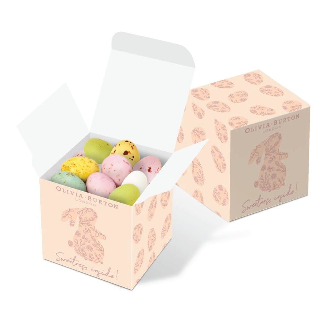 Nestled inside this eco-cube are a collection of little speckled eggs. These egg-cellent little Easter treats have a delicate sugar shell and solid chocolate filling that makes them so moreish. Our sustainably sourced Eco Maxi Cube box is filled with 82g of these speckled eggs and can feature your design on every surface of the packaging. When empty, the box can be easily composted or recycled (or used to feather a new nest).